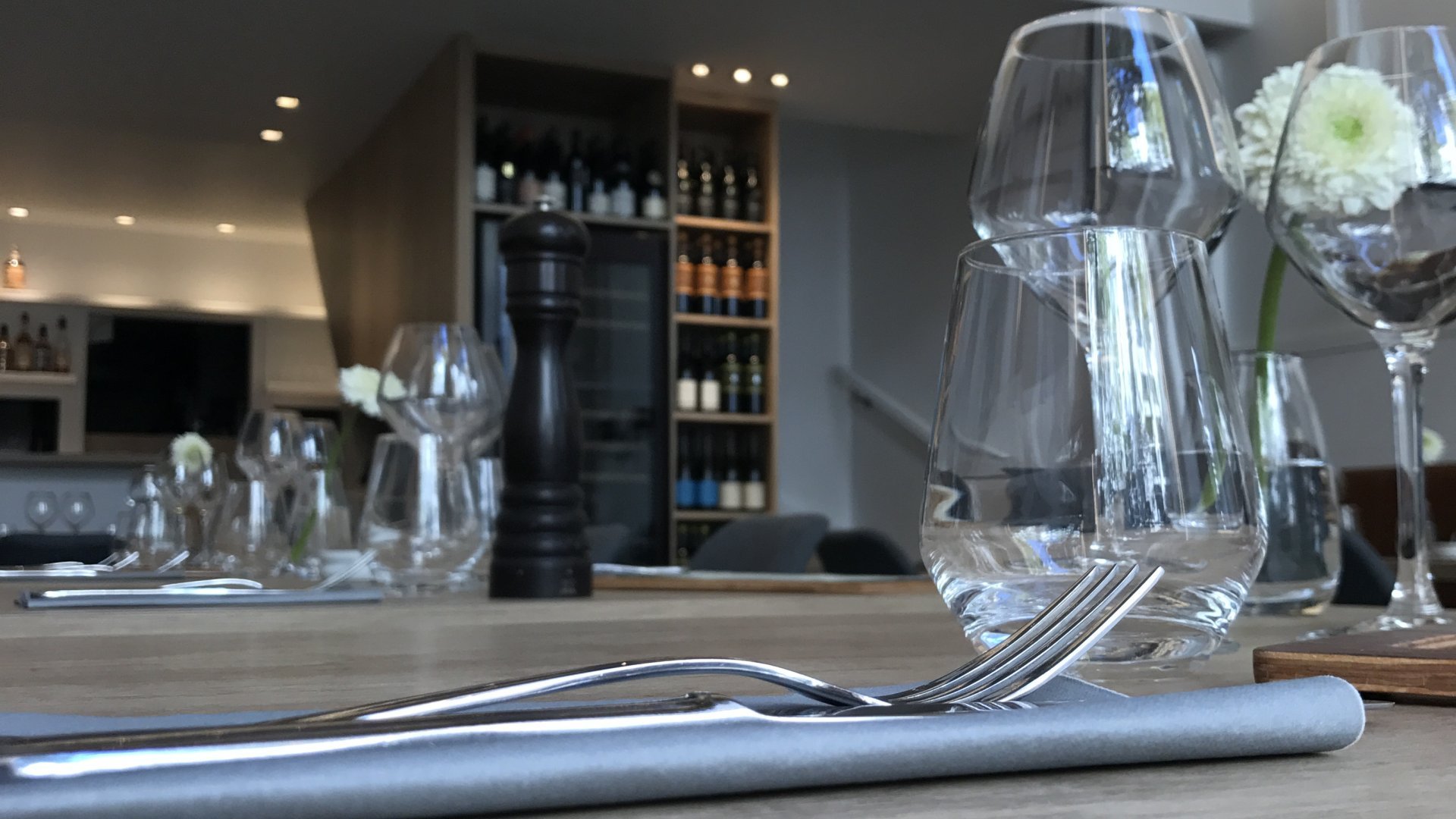 Des formes évidentes, carrées, juste parfaites pour une conversation à 2 ou plus. Des tables basses ou hautes, de bois blond. Des banquettes couleur Cognac et des chaises modernes de tissu gris pour une quarantaine de convives.